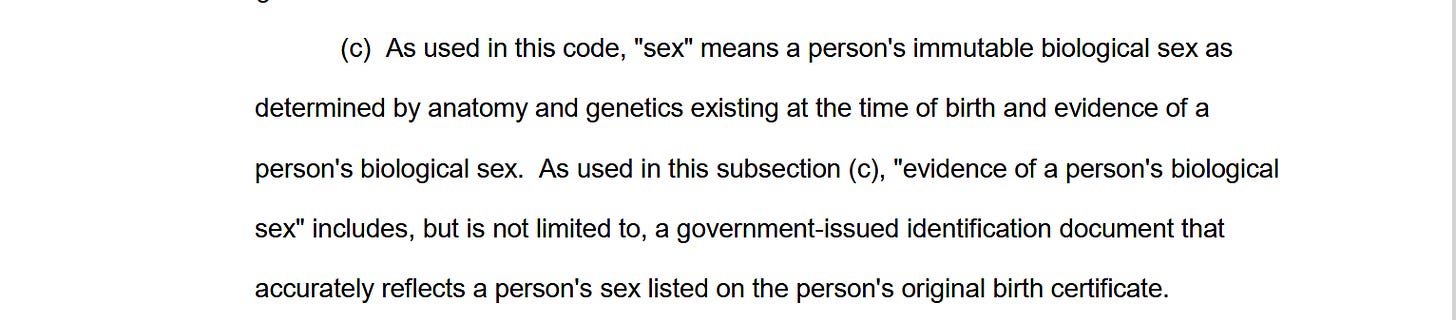 Tom: I am relieved to hear you say it since I have not yet found a religious justification for this law, but also because every law is supposed to be framed for everyone, regardless of religion. What are your non-religious justifications for writing “immutable biological sex” into the law?